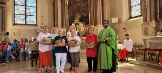 Zum Ende des Gottesdienstes verabschiedete Pater Sijoy Anneliese Denner, Asunta Wolfard, Gudrun Kalke, Gabi Keßler, Marlis Flachs, Ursula Ebert und Uschi Suermann aus dem Erwachsenenbildungskreis und dankte Ihnen für ihr ehrenamtliches Engagement, mit dem sie die Gemeinde fast 25 Jahre lang bereichert haben. Des Weiteren dankte er Uschi Suermann, die die Organisation des Lektoren- und Kommunionhelferdienstes nun an Maria Thommes übergibt. Zuletzt stellte er der Gemeinde das neue Küsterteam, bestehend aus Anna von Fournier, Barbara Groska und Martina Walter, vor.