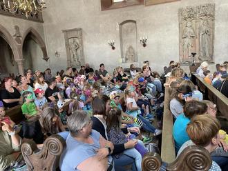 Die Kinder hatten sichtlich Spaß dabei, sich mit ihren Tüchern zur Musik zu bewegen und Geräusche nachzumachen. So bunt und lebendig ging es in der Klosterkirche schon lange nicht zu. Mal zischte oder schnalzte es, wenn die Meeresbewohner „abtauchten“, mal bewegten sich bunte Tücher zur Hochzeitsfeier wie bunte Fischschwärme im Korallenriff!