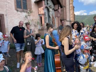 Die Geschichte von Melusina hatte sich die Harfenistin Jelena Engelhardt ausgedacht und den Kundern auch vor Ort selbst erzählt. Das musikalische Konzept hat das Ensemble gemeinsam entwickelt und damit das große und kleine Publikum begeistert. Am Ausgang wurden die Kinder mit „Drachenfutterkeksen“ gestärkt, und im Gegenzug bedankten sie sich mit Wolken von Seifenblasen.