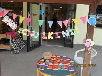 Dass die Farben auch richtig sind. Als letztes mussten wir dann unser Bild auf dem ausgeschnittenen Stift suchen und unterschreiben. Das wurde dann an einen Faden gehängt, der da so hing. Das haben die Schulkinder gemacht und die anderen Kinder haben zugeschaut und angefeuert. Da mussten wir uns richtig beeilen und alle Maxis haben es geschafft.“