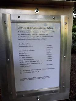 Daran erinnert die dortige Tafel, die der Hirschhorner Georg Bannert gefertigt und aufgestellt hat, wonach eine Hinrichtung durch den Strang damals 5 Gulden kostete. Tröstlich darf uns die Tatsache stimmen, dass Ritter Friedrich die Todesstrafe meist in eine Geldstrafe umwandelte.