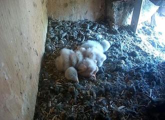 Es sollten noch vier weitere Eier zu dem Gelege hinzukommen, bevor dauerhaft bebrütet wurde. Dabei mussten wir schmerzlich wahrnehmen, dass das Weibchen wohl durch einen Unfall am linken Bein verletzt war, was für einen Greifvogel äußerst hinderlich ist. Das letzte fünfte Ei war merkwürdigerweise etwas größer und anders gefärbt als die anderen vier. Im Laufe des Brutgeschäfts verschwand dieses Ei wieder, vielleicht war es unbefruchtet. Etwas froh waren wir darüber, dass das Paar mit dem Handicap des Weibchens dieses Jahr nur vier statt bis zu sieben Junge großzuziehen hatte. Nach vier Wochen schlüpfte das erste Junge. Immer ein oder zwei Tage später das nächste. Vier Flaumknäuel lagen nun im Nest und wurden von der Mutter versorgt. Der Terzel schaffte die Beute heran, die Mutter zerkleinerte und verfütterte sie.
