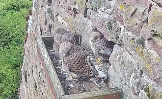 So konnten alle vier Jungfalken behütet aufwachsen und ausfliegen. Durch den unterschiedlichen Brutbeginn, waren auch die Jungvögel unterschiedlich entwickelt, nachts kehrten die Jungen gerne wieder ins Nest zurück. Nun wurden die flüggen Jungen draußen weiter gefüttert. Nach einigen Tagen stellten Beobachter vor Ort fest, dass ein Jungvogel auf dem Boden saß, wahrscheinlich das Nesthäkchen. Eine Suche nach ihm blieb zunächst erfolglos. Wenn die Jungen auf dem Boden sitzen, werden sie aber von den Falken nicht gefüttert. Leider wurde er erst zwei Tage später erneut gesehen und in fachkundige Hände gegeben. Er war schon so geschwächt, dass auch die verspeiste Maus ihn nur noch einen Tag weiterleben ließ.