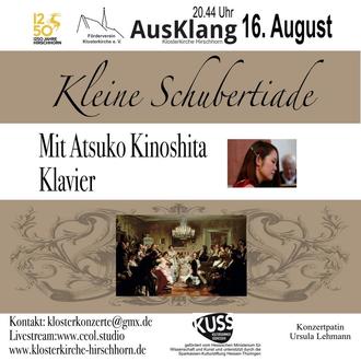 Bei den AusKlang-Abenden ist Atsuko Kinoshita ein gern gesehener Gast, nicht zuletzt auch, weil sie einen besonderen Kontakt zum Publikum aufbaut. Sie moderiert ihre Konzerte selbst und mitunter erläutert sie ihren Zuhörern einzelne, besonders bemerkenswerte Passagen. Auf ihre „Kleine Schubertiade“ darf man also gespannt sein.