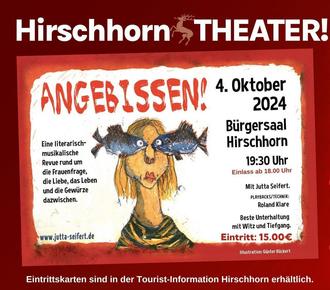 Im Rahmen der Thematik „Frau“, findet in diesem Zusammenhang das Theaterstück „Angebissen“ am Freitag 4. Oktober, Einlass ab 18:00 Uhr, im Bürgersaal statt.