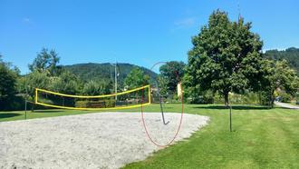 Bedauerlicherweise wurde vor kurzem das neu errichtete Volleyballfeld in Mitleidenschaft gezogen. Einer der Stahlpfosten vom Volleyballnetz, das mit einem Betonfundament versehen wurde, hat sich durch das Anhängen einer Person oder eines anderen Gewichts verzogen.