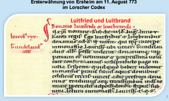 Am 11. August 773, auf den Tag genau vor 1250 Jahren, gaben die Herren Liutfried und Liutbrand dem Kloster Lorsch ihren gesamten Besitz in dem damals zum Elsenzgau gehörenden Dorf Ersheim. Der heute vergessene Elsenzgau ging im Kraichgau auf. Die Stiftung umfasste Hofreiten, Wiesen, Wälder, Gewässer, Wohnhäuser, Wirtschaftsbauten, Äcker und Weingüter.