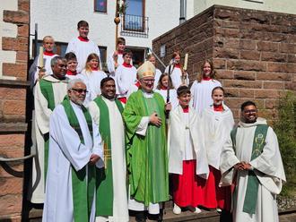 Um 9.30 Uhr am Sonntag, 10. August 2025, war die Sakristei der Maria-Immaculata-Kirche in Hirschhorn/Neckar leicht überfüllt. Bischof Peter Kohlgraf, Bischof von Mainz, hatte sich angesagt, um mit den indischen Patres ein Pontifikalamt zu feiern. Auch der frühere Pfarrer und heutige Priesterreferent im Bistum, Pater Joshy O.Carm., war mit aus Mainz nach Hirschhorn gekommen, sehr zur Freude der Teilnehmer. Gläubige aus Bad Wimpfen, Neckarsteinach, Hirschhorn und aus dem badischen Heddesbach füllten die Kirche und freuten sich auf diesen besonderen Gottesdienst. Nach dem großen Einzug mit vielen Ministranten mit Orgelmusik von Herrn Öhrig, begrüßte Pfarrer Pater Sijoy O.Carm. Bischof Kohlgraf und bat ihn, den Gottesdienst zu eröffnen. So begann man mit einem Lied aus dem Gotteslob unter großer Unterstützung der Jugendband mit -chor, fröhlich gestimmt, die Hl. Messe. In seiner Predigt nahm Bischof Kohlgraf Bezug auf die beiden Lesungen, ausdrucksstark vorgetragen von Claudia Makswitis und Ursula Suermann, Heddesbach, und kam intensiv auf den Glauben der Menschen im Alten Testament sowie der Christen in unserer heutigen Zeit zu sprechen.