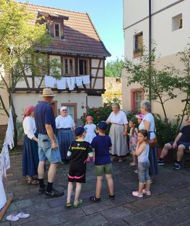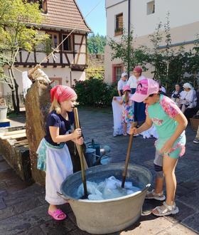 Mit großem Eifer machten sich die Kinder ans Werk: Ausgestattet mit Waschbrettern, Stampfern, Zinkwannen und duftender Kernseife lernten sie spielerisch, wie früher gewaschen wurde. Unterstützt wurden sie dabei liebevoll von Mitgliedern des katholischen Frauentreffs, die sich über den großen Andrang und die begeisterten kleinen Helferinnen und Helfer sehr freuten. Der Platz war bis zum Ende des Nachmittags dicht bespannt mit Wäscheleinen, an denen fröhlich flatternde, frisch gewaschene Wäschestücke zum Trocknen hingen – ein schöner Anblick und ein echtes Gemeinschaftserlebnis.