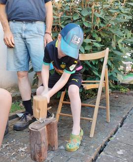 Doch nicht nur Wäsche wurde gewaschen: Auch alte Handwerkstechniken standen auf dem Programm. Unter Anleitung von Paul Keßler durften die Kinder selbst Rechenzacken aus Holz schlagen – ganz wie es früher gemacht wurde. Mit viel Geschick, Konzentration und Spaß wurde gehämmert. Viele Kinder hielten am Ende stolz ihr selbstgefertigtes Werkstück in den Händen – ein echtes Stück Handarbeit mit Geschichte.