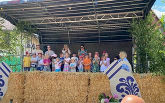 Im Juli liefen die Schulanfänger und Heddesbacher Kinder nach Heddesbach, um dort bei der Kerwe auf der Bühne einen musikalischen Beitrag zu präsentieren. Viele Leute sind extra gekommen, um unsere Kinder zu sehen und zu hören. Nachdem alle ihren Mamas, Papas, Omas, Opas, Onkels, Tanten und Freunden gewunken hatten, konnte es mit unseren Liedern losgehen.