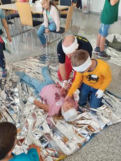 Nach einer kleinen Pause ging es weiter mit dem Thema Verletzungen. Hier durften die Kinder selbst Hand anlegen: Pflaster wurden gekonnt angebracht, "Wunden" fachgerecht versorgt und Verbände angelegt. Besonders spannend war für viele das Üben der stabilen Seitenlage, mit der bewusstlose Personen sicher gelagert werden.