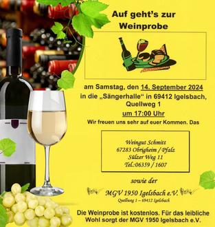 Eine kostenlose Weinprobe mit Weinen aus Obrigheim in der Pfalz mit dem Weingut Schmitt findet am Samstag 14. September in der Sängerhalle in Igelsbach, Quellweg 1, statt, und beginnt um 17:00 Uhr.