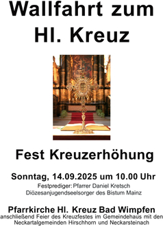 | 09:30 Uhr 10:00 Uhr 11:00 Uhr | Hl. Messe, Neckarsteinach Kreuzfest Hl. Kreuz, Bad Wimpfen Hl. Messe, Pfarrkirche Hirschhorn |