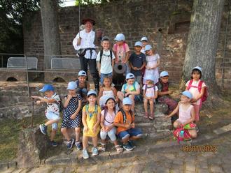 Am 19. Juli war der offizielle Abschied von den Maxi Kindern mit den Eltern. Nachmittags ging es erstmal alleine los. Alle Maxi Kinder trafen sich auf dem Schloss in Hirschhorn. Dort begrüßte uns Ritter Friedrich III.. Den kannten wir schon, weil er uns schon mal im Kindergarten mit seinem Schwert besuchte. Gemeinsam mit ihm machten wir eine Burgführung. Er hat uns ganz viel im Schloss gezeigt und über die Ritter erzählt. Besonders toll war, dass wir bis ganz nach oben in den Turm hochgehen durften. Das war sehr hoch!
