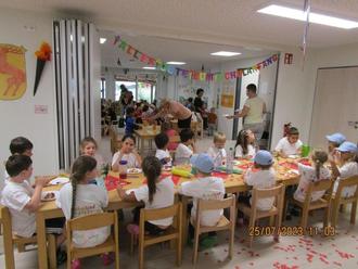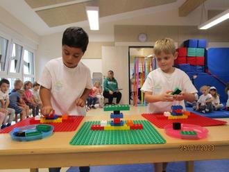 Als erstes einen Turm nachbauen mit Duplosteinen, dann sind wir Slalom gerannt und zum Schluss haben wir noch unseren Namen aufgeschrieben. Alle Maxis haben es geschafft! Danach haben wir noch das Abschlusslied gesungen und sind runter ins Bistro. Es war extra ein Tisch nur für uns Maxis gerichtet. Mit viel Deko. Und wir durften uns zuerst was zu essen am Buffett holen. Das war toll. Das war unser letztes Fest in der Kita und nach den Ferien gehen wir in die Schule.
