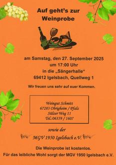 Es ergeht eine herzliche Einladung zu einer kostenlosen Weinprobe mit Weinen aus Obrigheim in der Pfalz, präsentiert vom Weingut Schmitt. Für den kleinen Hunger zwischendurch bietet der MGV Igelsbach einen deftigen Winzerteller mit Wurst und Schinken oder mit Käse zum Essen an.