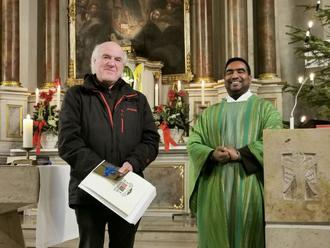 Herr Karlo Schölch wurde für sein jahrelanges Engagement im Verwaltungsrat der Gemeinde und als Gründer des Kirchenkaffees und der Reise-AG mit großem Dank von Pater Sijoy verabschiedet.
