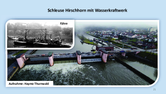 Neue Arbeitsplätze schuf man mit der Neckarkanalisierung und der Eröffnung der Schleuse im Jahre 1933 für die Großschifffahrt, wodurch die Schiffer mit ihren großen Frachtschiffen in Hirschhorn anlegen konnten. Mit dem zur Schleuse gehörenden Wasserkraftwerk, das genau vor 90 Jahren in Betrieb ging, können bei kompletter Ausnutzung der Turbinenleistung jährlich 35,3 Mio. kWh regenerative Energie produziert werden. Der Schleusenbau war mit der Errichtung einer Brücke auf die Ersheimer Seite verbunden. Zuvor war die Überfahrt für Prozessionen, Totengeleite und Friedhofsbesuche nur mit einer Fähre oder per Nachen möglich. Die Brücke bildete den Ausgangspunkt für die Erschließung des heutigen Stadtteils Ersheim.
