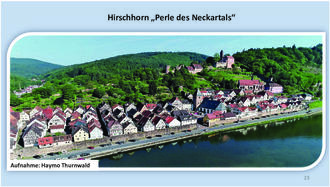 Von der Ersheimer Seite hat man den schönsten Blick auf die Hirschhorner Stadtkulisse. Bereits zu Beginn des 20. Jahrhunderts konnte man in Werbeprospekten lesen: „Hirschhorn, die Perle des Neckartals! Ein Stück Mittelalter in unserer modernen Zeit“.