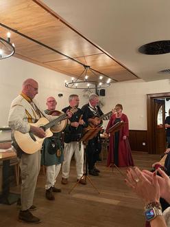 Die „mitgereisten“ Minnesäger (Jutta, Axel, KJ, Michael und Mike) konnten zwischen den Gängen des Mahles, einmal mehr ihr Können unter Beweis stellen und sorgten in verschiedenen Sequenzen für die musikalische Unterhaltung des Abends. Auch der altbekannte „Baumeister“ kam wieder einmal zur Aufführung.