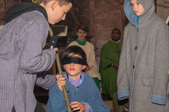 Und tatsächlich traten nacheinander die Theater-Kids aus der Bibel und spielten die Geschichte von Jesus Besuch in der Stadt Jericho nach. Durch die laute Menschenmenge hört Jesus den Ruf des blinden Bartimäus, der darum bittet, zu Jesus geführt zu werden. Als er vor dem Gottessohn steht, sagt dieser zu ihm „Geh, dein Glaube hat dich geheilt.“ Und richtig: Bartimäus kann wieder sehen.