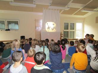 Heute Morgen war es dann soweit. Unser Bewegungsraum wurde abgedunkelt und die vielen, kleinen Lichter zauberten eine besonders gemütliche Atmosphäre ein. Die Kinder schauten gespannt dem Schattenspiel von St. Martin zu.