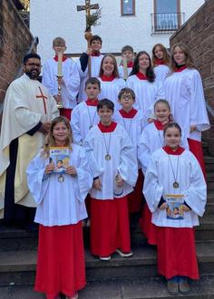 Am Hochfest Christkönig, dem letzten Sonntag im Kirchenjahr, wurden unsere neuen Ministranten offiziell eingeführt. Nach ihrer Erstkommunion hatten sich Carlotta, Felix, Helena, Ida, Jan, Magarete, Mila und Oskar aus unserer Gemeinde entschieden, Ministranten -kurz Mini- zu werden. Sie hatten ja schon einige Monate Zeit die ersten Erfahrungen zu sammeln, jetzt wurden sie in den Kreis der Ministranten aufgenommen. Sie erhielten die von Pater Alex gesegneten Ministranten-Plakette, ein Zeichen, dass sie zur großen Gemeinschaft der Kirche gehören, überreicht. Die Gemeinde bedankte sich mit einem kräftigen Applaus, dass sie diesen Weg eingeschlagen haben.