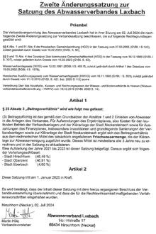 Im Namen der Aufsichtsbehörde des Landkreises Bergstraße, wird die am 02.07.2024 durch die Verbandsversammlung des Abwasserverbandes Laxbach beschlossene, am 02.07.2024 ausgefertigte, und am 19.11.2024 durch die Aufsichtsbehörde genehmigte „Zweite Änderungssatzung zur Satzung des Abwasserverbandes Laxbach vom 18.12.2018“ gemäß § 30 der Verbandssatzung öffentlich bekanntgemacht.