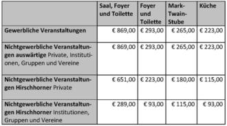 Nach § 6 Ziffer 6 der Gebührenordnung der Stadt Hirschhorn (Neckar) für die Nutzung des Hirschhorner Bürgersaals, sind die Gebührensätze nach § 6 Ziffer 1 und 5 jedes Jahr um 5 % zu erhöhen und auf volle Euro aufzurunden. Sie sind am Ende eines jeden Kalenderjahres im amtlichen Bekanntmachungsorgan der Stadt Hirschhorn zu veröffentlichen: