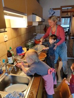 Manche Kinder werden vom Duft aus der Küche angelockt und helfen, im Kochtopf zu rühren oder hantieren mit der Spülbürste im Waschbecken daneben. Während der Arbeit und dem Spiel wird viel gesungen. Erklingt später unser Glockenspiel, gesellen sich die Kinder um den Tisch, hören zu oder dürfen selbst auf dem Instrument spielen.
