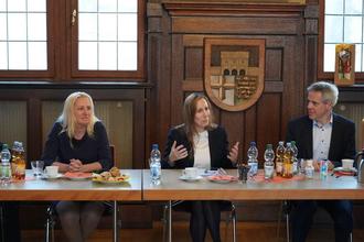 Ein zentrales Thema des Zusammentreffens war die Digitalisierung: „Sie kann uns als besondere Chance dienen, Prozesse zu vereinfachen, mehr Bürgerinnen und Bürger am politischen Geschehen teilhaben zu lassen und Verwaltung und Gremienarbeit flexibler zu gestalten“, erklärte Wallmann. Besonders interessierte sich die Landtagspräsidentin in diesem Zusammenhang dafür, welche Erfahrungen die kommunalen Vertreterinnen und Vertreter während der Pandemie gemacht haben. Dabei kam unter anderem zur Sprache, dass es kleine Kommunen schwer haben, geeignetes Fachpersonal im IT-Bereich zu finden. Gerade in dieser Branche falle es öffentlichen Institutionen schwer, mit dem freien Markt mitzuhalten, unter anderem, was die Bezahlung angehe.