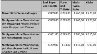 Nach § 6 Ziffer 6 der Gebührenordnung der Stadt Hirschhorn (Neckar) für die Nutzung des Hirschhorner Bürgersaals, sind die Gebührensätze nach § 6 Ziffer 1 und 5 jedes Jahr um 5 % zu erhöhen und auf volle Euro aufzurunden. Sie sind am Ende eines jeden Kalenderjahres im amtlichen Bekanntmachungsorgan der Stadt Hirschhorn zu veröffentlichen: