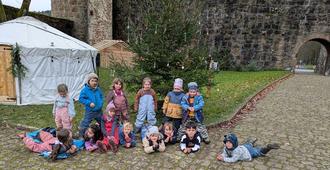 Zu diesem Zweck wurde vom Veranstalter der Burgweihnacht ein Tannenbaum iim Burghof aufgestellt. Und in der Woche vor dem 1. Advent schmückten Kinder aus Hirschhorn und Umgebung diesen Baum. Und er wurde geschmückt; jeden Tag waren mehr bunte Aufhänger, Strohsterne, bunte Tannenzapfen und andere Schmuckstücke am Baum zu sehen.