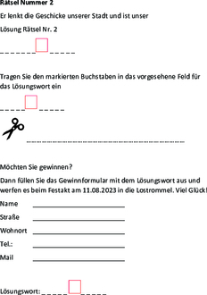 So viel Rätseleifer wird belohnt. Das Lösungswort werfen Sie am 11.08.2023 während des Festakts in den dortigen Behälter. Während des Lichterfestes am 23.09.2023 werden die Gewinner gezogen und dürfen sich auf den ersten Preis in Höhe von 75 Euro, den zweiten Preis in Höhe von 50 Euro und den dritten Preis in Höhe von 25 Euro freuen.