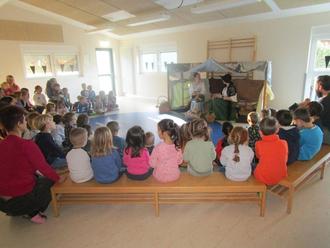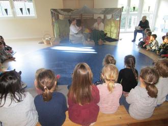 Um den Einstieg für die Kinder anschaulicher zu gestalten, wurde ein kleines Theaterstück aufgeführt. Die gebastelte Uhr wurde zurück gedreht und es kamen zwei Frauen aus dem Jahr 773 zu Besuch, die sich einiges zu erzählen hatten. Vor allem war den Frauen an diesem Morgen ihr „Feuer“ ganz wichtig, an dem sie sich wärmen und auch ihr Wasser heiß machen konnten, für eine gemütliche Tasse Tee.