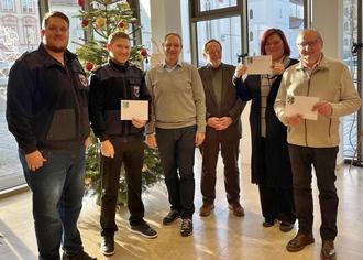 Auch in diesem Jahr spendet der Personalrat des Landratsamts für ganz besondere Zwecke. Je ein Betrag in Höhe von 400 Euro gehen an die AWO-Suppenküche Pfaffenhofen und an den Tierschutzverein Pfaffenhofen sowie 800 Euro an das Spendenkonto für den kürzlich verstorbenen Jetzendorfer Feuerwehrmann. Personalratsvorsitzender Willi Knoll (3.v.l.) übergab jetzt die Spenden an (v.l.n.r.) Florian Bachmeier und Stefan Zeller von der Freiwilligen Feuerwehr Jetzendorf, AWO-Vorsitzenden Volker Hoppe, stv. Vorsitzende des Tierschutzvereins Petra Faltermeier und Walter Regensburger von der Suppenküche Pfaffenhofen.