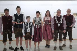 v.l. Schützenmeister Franz Plöckl, Moritz Weichselbaumer, Leopold Ottenloher, Christa Lutz, Carmen Nothing, Xaver Reicheneder, Peter Hainzlmeier