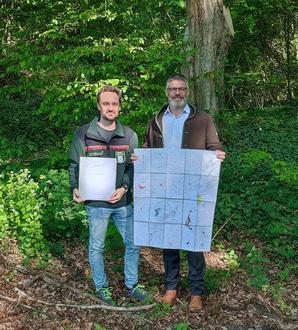 Das Foto zeigt Revierförster Andreas Ploner bei der Übergabe des Forstwirtschaftsplanes an den 1. Bürgermeister Jürgen Haindl.