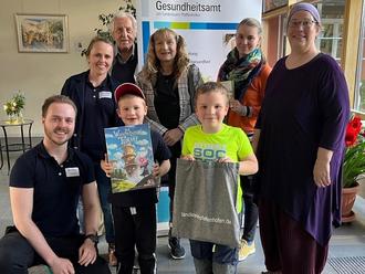 Die Gewinnerinnen und Gewinner der Verlosung mit Marvin Kling (li.) und Corinna Weltge (2.v.l.) vom Gesundheitsamt sowie Christiane Hofbauer (re.) vom Spieltreff „Vui Spuin“.