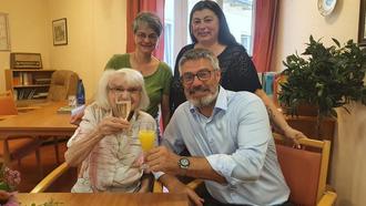 97 Jahre alt und immer noch den Schalk im Nacken, so kann man Frau Rosemarie Lüdtke mit wenigen Worten beschreiben. Die Gratulanten, zu denen auch Bürgermeister Jürgen Haindl, Einrichtungsleitung Cristina Weckler und ihre Enkelin gehörten, konnten sich davon überzeugen. Frau Lüdtke erfreut sich guter Gesundheit und fühlt sich im Seniorenzentrum Novita in Hohenwart sichtlich wohl.