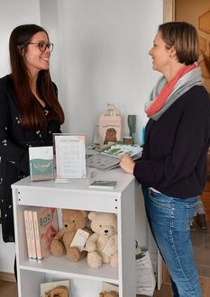 Sandra Baumann bei der Eröffnung ihres FLOATINI Baby Spa im Gespräch mit KUS-Gründerberaterin Saskia Stadlmeir.