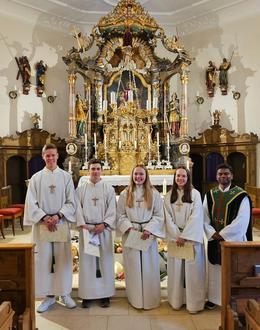 Ein besonderer Akzent des Gottesdienstes lag auch auf den Ministranten: Mit Moritz Weichselbaumer, Simon Großhauser, Hanna Schlittenbauer und Magdalena Reitberger (v.l.) wurden vier langjährige Minis feierlich verabschiedet und für ihren treuen Dienst am Altar gewürdigt. Kaplan P. Gaddam dankte ihnen im Namen der Gemeinde für ihr Engagement und ihren Einsatz über viele Jahre hinweg. Wir wünschen ihnen alles Gute, Kraft und Zuversicht für ihren weiteren Lebensweg.