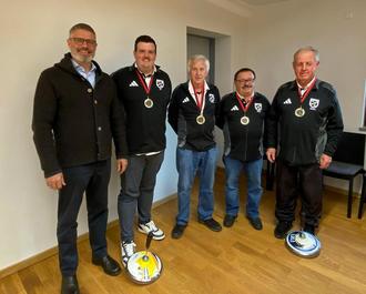 Da die ersten vier Plätze zum Aufstieg berechtigten war man somit am Ende der Punktrunde in die Kreisoberliga aufgestiegen. Bürgermeister Jürgen Haindl hatte die erfolgreichen Sportler am Dienstag, den 14. Oktober 2025 zu sich ins Rathaus eingeladen, um Ihnen im Namen der Marktgemeinde zu gratulieren und ihnen eine Medaille zu überreichen.