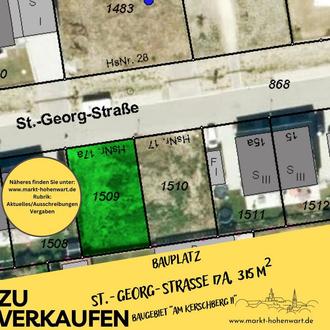 Es handelt sich um das Grundstück St.-Georg-Straße 17a (315m²) Das Grundstück befindet sich in der Nähe des Ortskerns von Hohenwart sowie der Schule und Kindergarten/-krippe und der Mindestpreis beträgt 495 Euro/ m². Somit müsste das Mindestgebot 155.925 Euro betragen.