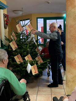 Die Bewohner es Seniorenzentrums schmücken den Tannenbaum mit ihren Wünschen.