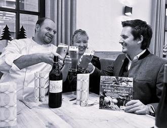 Thomas Schwarzbauer mit Ehefrau Claudia, Betreiber des Gasthofes Metzgerbräu in Hohenwart und KUS-Vorstand Johannes Hofner stoßen auf das erste Exemplar der neuen Genussbroschüre an.