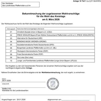 Die Bekanntmachung der zugelassenen Wahlvorschläge für die Wahl des Kreistags sehen Sie auf unserer Homepage: www.markt-hohenwart.de.