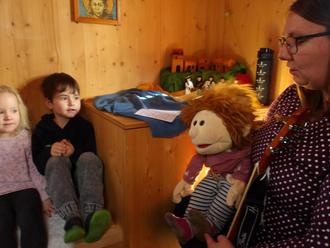 Lebensfroh und einfühlsam erzählte Frau Dachs mit ihrer Handpuppe Paul die Geschichte „Jesus findet Freunde“.