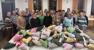 Auch in diesem Jahr ist es den Damen des Frauenbundes wichtig, sich am Aufruf des KDFB Landesverbandes Bayern zur Aktion „Herzkissen – Frauen für Frauen“ zu beteiligen. Die Herzkissen tragen dazu bei, Schmerzen und Spannungen nach einem chirurgischen Eingriff bei Brustkrebs zu lindern. Zugleich spendet die schöne Form der Kissen mit den farbenfrohen Stoffen auch Trost in einer schwierigen Lebenssituation. Motiviert durch das produktive Ergebnis vom Vorjahr (77 Kissen) legte man heuer die Messlatte sehr hoch und steuerte das Ziel an, 120 Herzkissen zu nähen. Durch die unermüdliche Vorarbeit der Schneiderin Monika Gottwald, die die Stoffe besorgte und vorbereitete, durch die eifrige Koordination im Voraus von Barbara Schweiger und durch fleißige Helferinnen, die dafür sorgten, dass schon 60 Kissen zum Füllen vorbereitet waren, konnten 32 Damen am Nähabend unverzüglich zur Tat schreiten. Es wurde Füllmaterial abgewogen, Stoffe mussten in Form geschnitten werden, Nähmaschinen wurden bedient, Kissen gefüllt und schließlich per Hand zugenäht und mit einem liebevollen Anhänger mit den besten Wünschen zur Genesung bestückt. Für jede Begabung war etwas dabei, und so konnte man am Ende sehr stolz auf 122 Kissen mit 18 verschiedenen Stoffmustern sein. Abschließend saß man noch gemütlich bei Kuchen und Getränken zusammen.